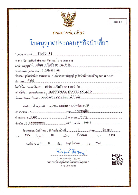 4.6 รีวิวทั้งหมด 1 คน Wonder Group เลขที่ใบอนุญาต: 11/09051 ที่อยู่: บริษัท แมรี่พลัส ทราเวล จำกัด 525/457 หมู่บ้านทาวน์พลัส แสนสิริ ถ.ประชาอุทิศ แขวงทุงครุ เขตทุ่งครุ กทม.10140
